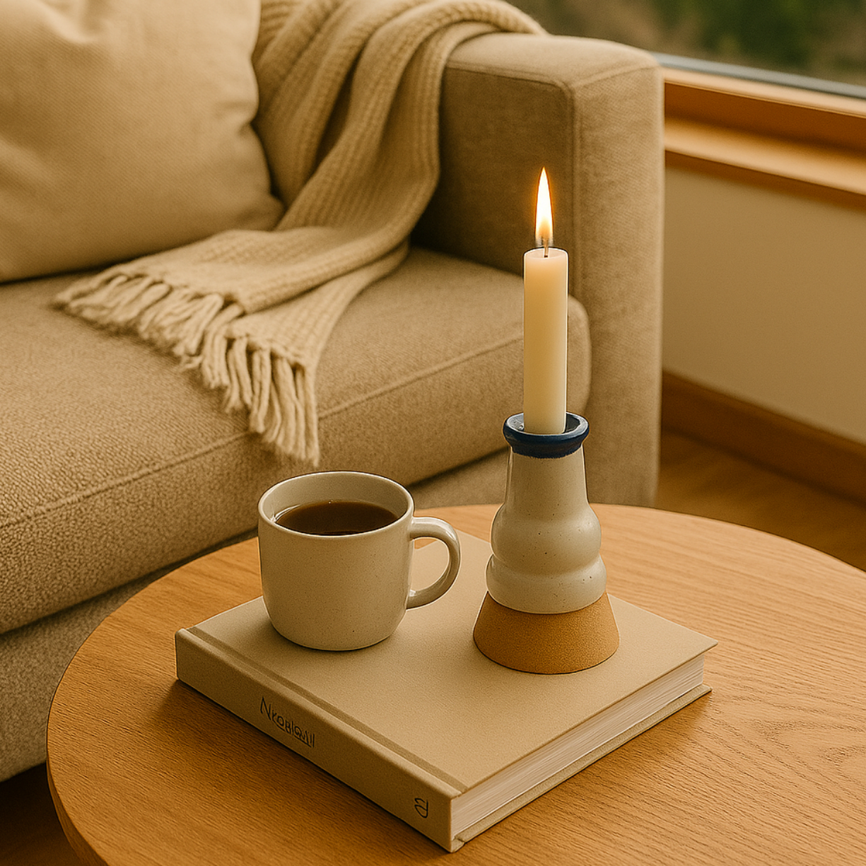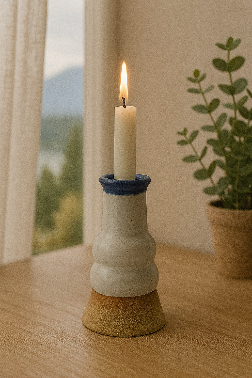 Candelabro de gres esmaltado en blanco, con detalles en óxido de cobalto que generan sutiles acentos en azul.